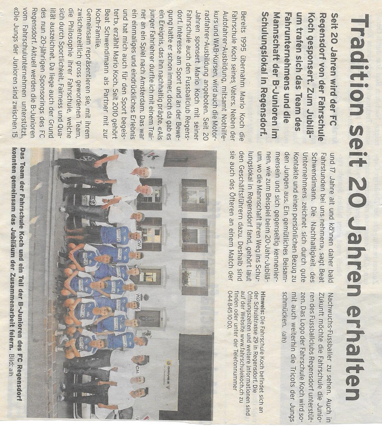 Seit 20 Jahren wird der FC Regensdorf von der Fahrschule Koch gesponsert. Zum Jubiläum trafen sich das Team des Fahrunternehmens und die Mannschaft der B-Junioren im Schulungslokal in Regensdorf.