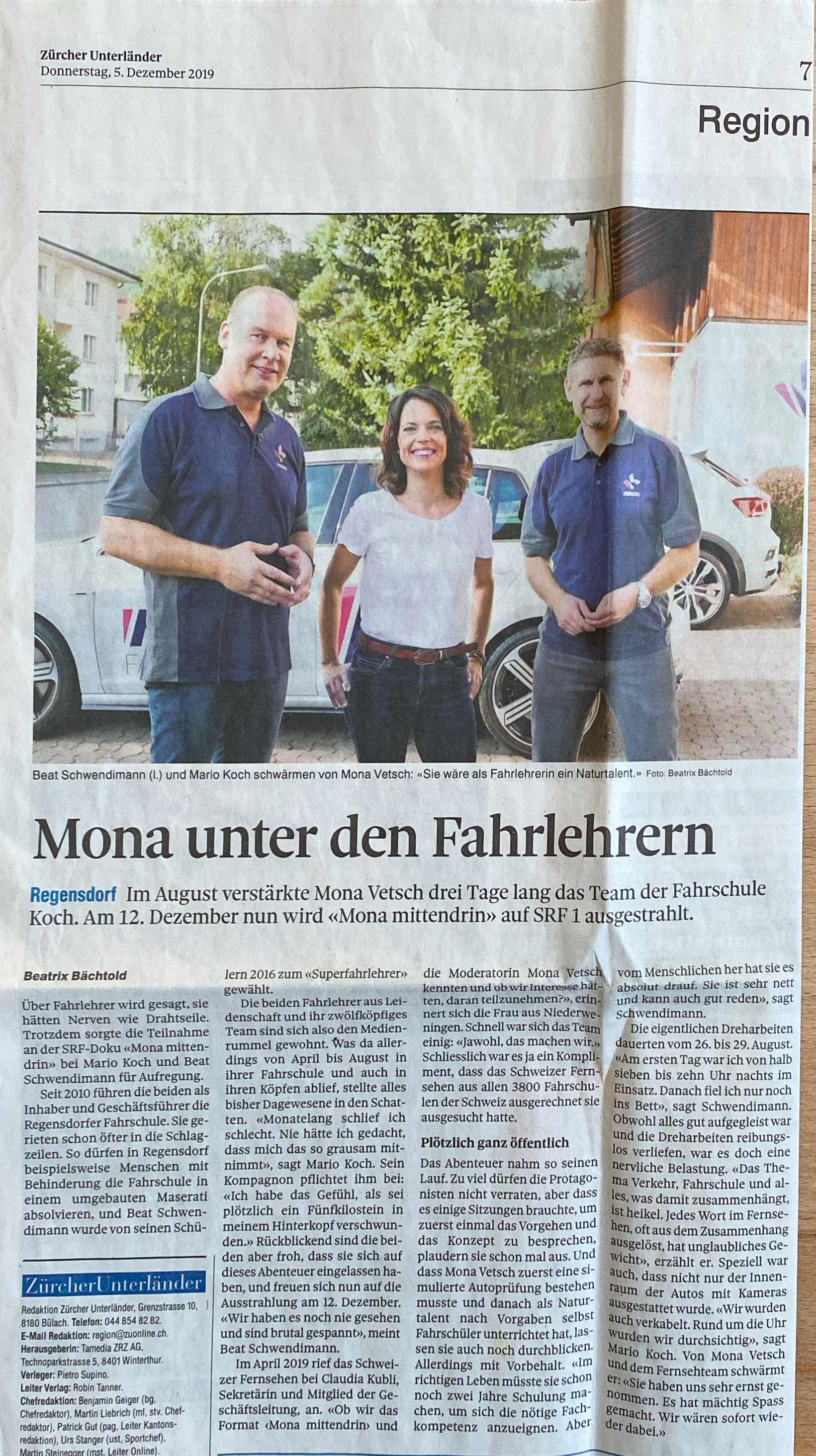 Mona Vetsch mit dem Format "Mona mittendrin" war drei Tage bei der Fahrschule Koch zu Besuch. Hier der Film und Artikel des Zürcher Unterländers. https://www.srf.ch/play/tv/mona-mittendrin/video/mona-mittendrin-bei-fahrlehrern?id=e2dae135-eb44-4d3f-8cb4-b832c9a2c54c
